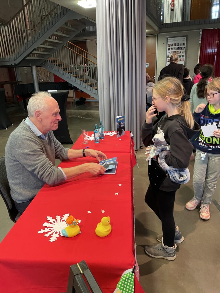 Im Anschluss warteten in der Rohrmeisterei verschiedene Mitmachstationen auf die Kinder. Dort konnten sie beim Entenangeln ihr Geschick unter Beweis stellen, eigene Postkarten stempeln und natürlich auch Bücher erwerben. Besonders aufregend war die Möglichkeit, sich ihr Exemplar direkt vom Autor persönlich signieren zu lassen.