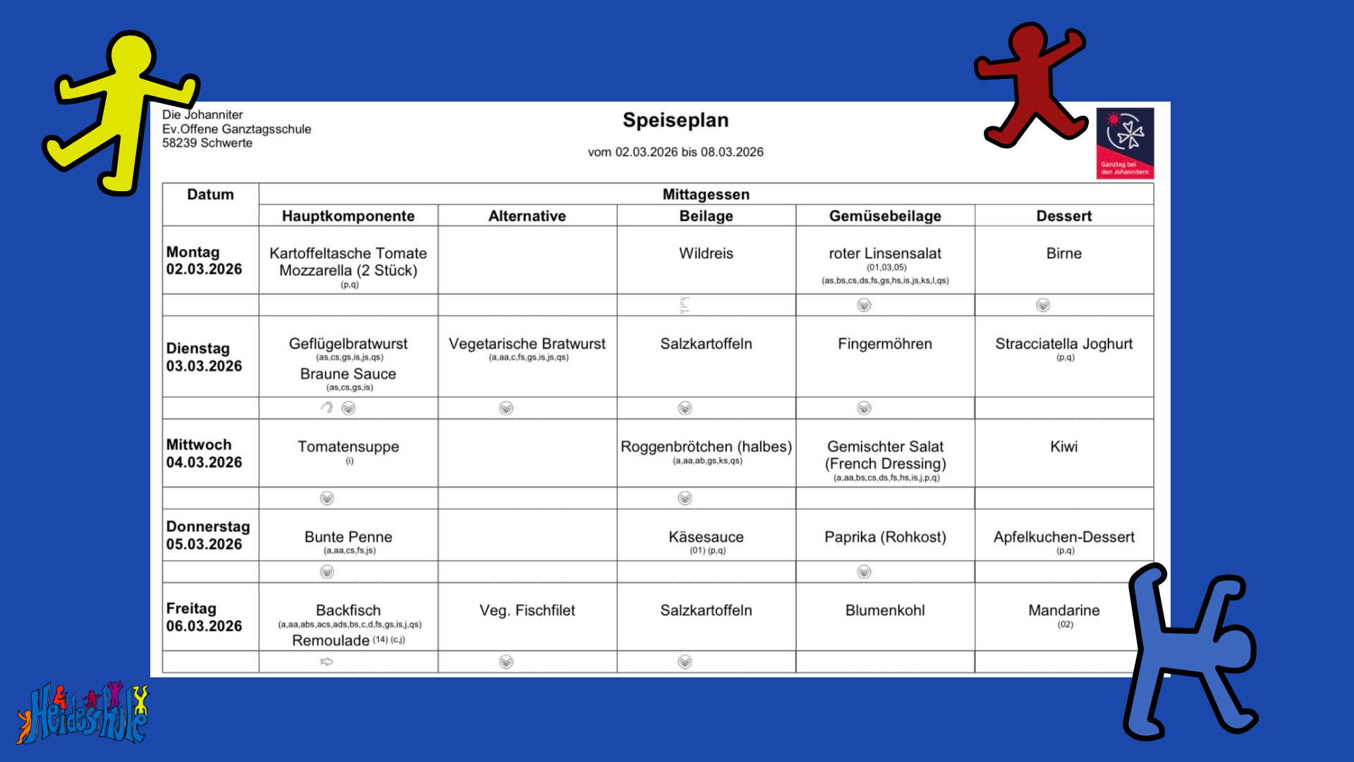 Die OGS bietet auch ein warmes Mittagessen an. Das Essen ist abwechslungsreich und auf den Geschmack von Kindern ausgerichtet. Ein Nachtisch, Getränke und ein Nachmittagssnack werden ebenfalls angeboten. Die Anmeldung für das Mittagessen ist verbindlich für ein Schuljahr. Den aktuellen Essenplan finden Sie hier: